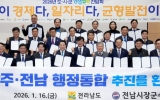 전남 이영욱 기자2026. 01.16[나이스데이]전라남도는 16일 전남도청 왕인실에서 ‘2026년 도-시군 상생협력 간담회’를 열어 지역 대도약을 위한 광주·전남 행정통합 추진에 도와 22개 시군이 공동 보조를 맞추기로 했다. 간담회는 김영록 전남도지사와 22개 시장·군수 등 관계자 100여 명이 참석한 가운데, 광주·전남 행정통합 추진계획과 전남도 재생에너지 추진전략을 중심으로 발표와 토론이 진행됐다. 이들은 광주·전남 행정통합을 통해 대한민국 제1호 통합 광역지방정부 출범을 목표로, 도와 시군이 상생 협력 의지를 재확인하고, 전남의 미래 성장 전략을 논의했다.…
